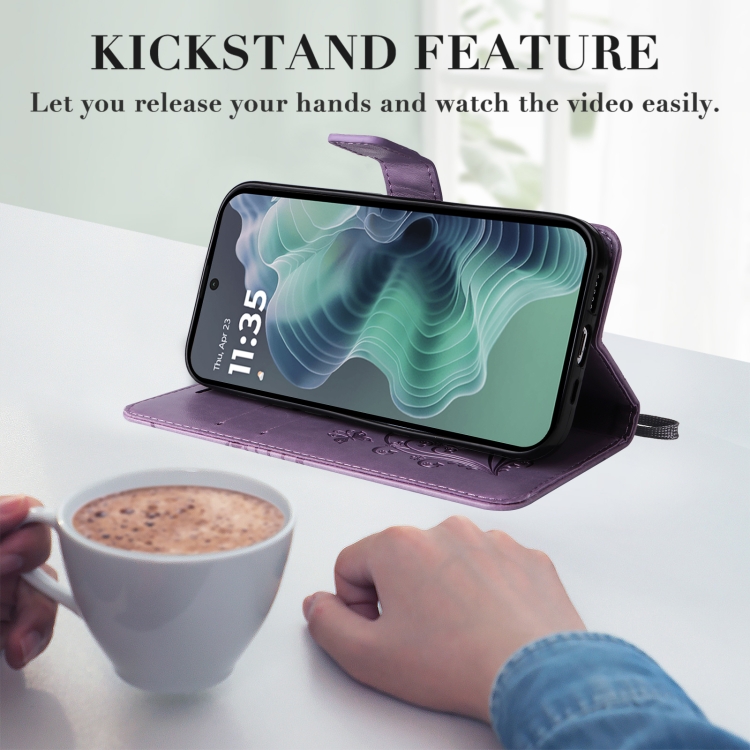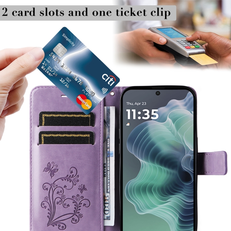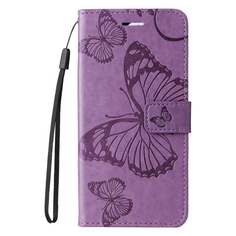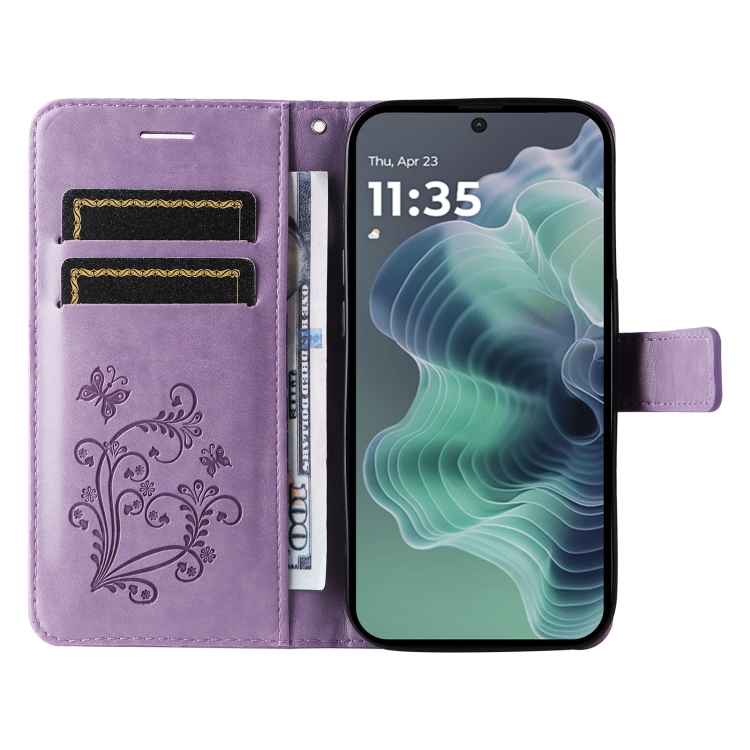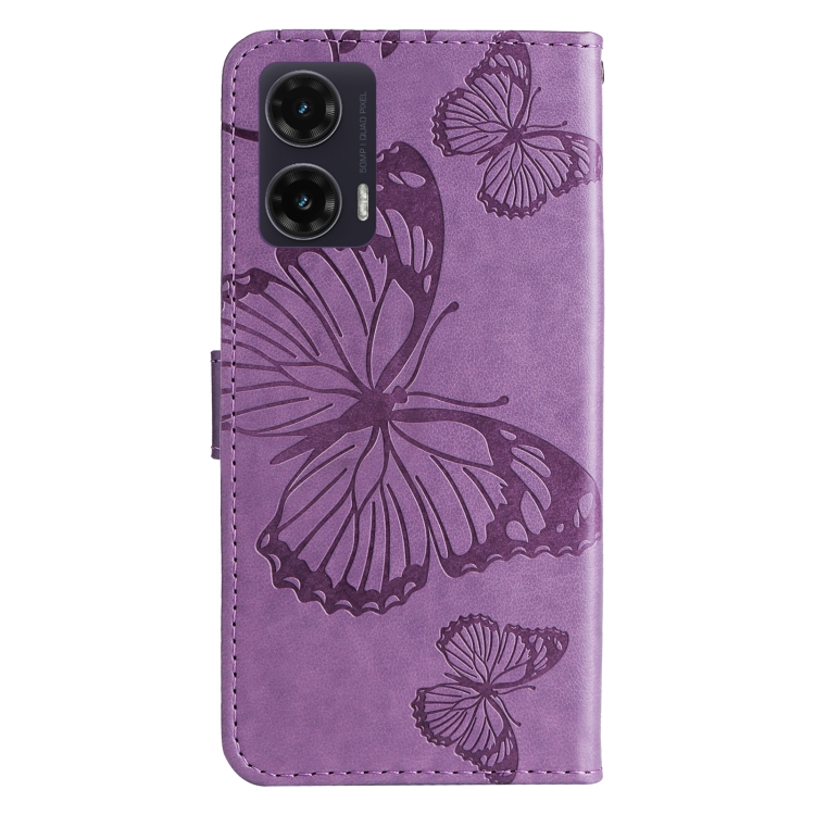 Funda de Cuero con Tapa y Mariposa en Relieve 3D para Motorola Moto G35 (Morado)