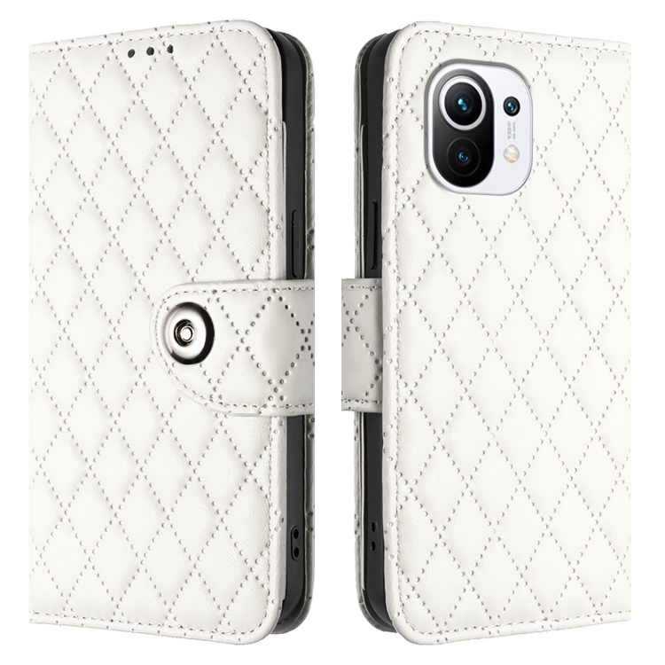 Funda de Cuero con Tapa y Textura Rómbica para Xiaomi Mi 11 con Cordón (Blanco)