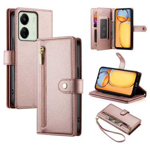 Funda de Cuero para Teléfono con Nueve Ranuras para Tarjetas y Cremallera para Redmi 13C 5G/4G/Xiaomi Poco C65 (Rosa)