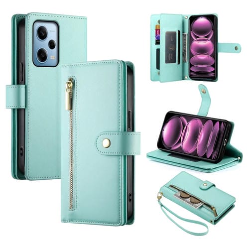 Funda de Cuero para Teléfono con Nueve Ranuras para Tarjetas y Cremallera para Redmi Note 12 Pro/Xiaomi Poco X5 Pro (Verde Menta)