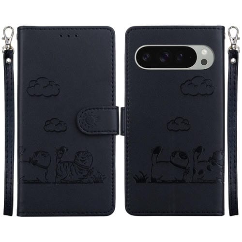 Funda de Cuero Rfid para Google Pixel 9 y 9 Pro con Diseño de Gatos (Negra)