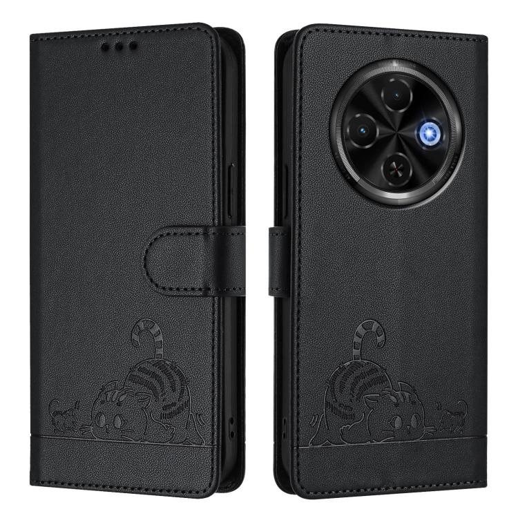 Funda de Cuero Rfid para Tecno Spark 30C 5G y Pop 9 5G con Estampado de Rata y Gato en Relieve y Cordón (Negro)