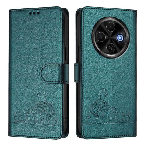 Funda de Cuero RFID para Tecno Spark 30C 5G y Pop 9 5G con Estampado de Rata y Gato y Cordón (Verde Pavo Real)