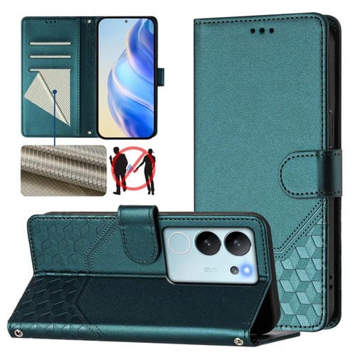 Funda de Cuero Rfid con Relieve de Panal Global para Vivo V29E 5G / Y200 5G (Verde Pavo Real)