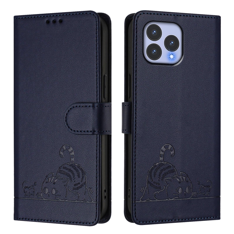 Funda de Cuero Rfid para Teléfono Wiko T60 con Relieve de Rata y Gato y Cordón (Azul)