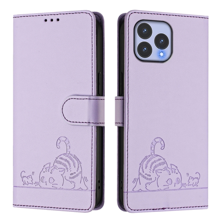 Funda de Cuero Rfid para Teléfono Wiko T60 con Relieve de Rata y Gato y Cordón (Morado)