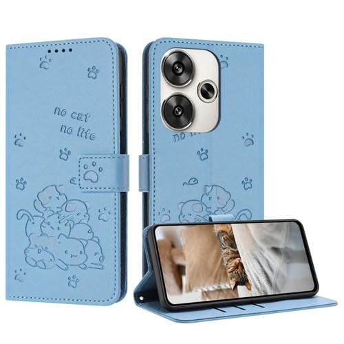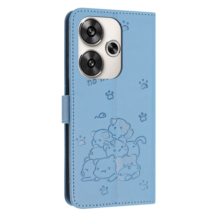 Funda de Piel con Diseño de Gatito En Relieve y Cordón para Xiaomi Poco F6 (Azul)