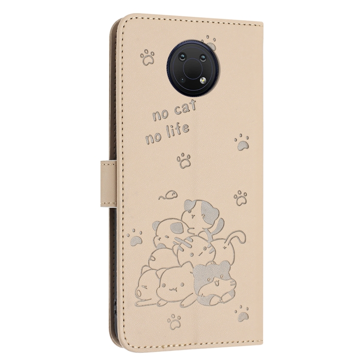 Funda de Piel para Nokia G10/G20/G300 con Diseño de Gatito en Relieve y Cordón (Beige)