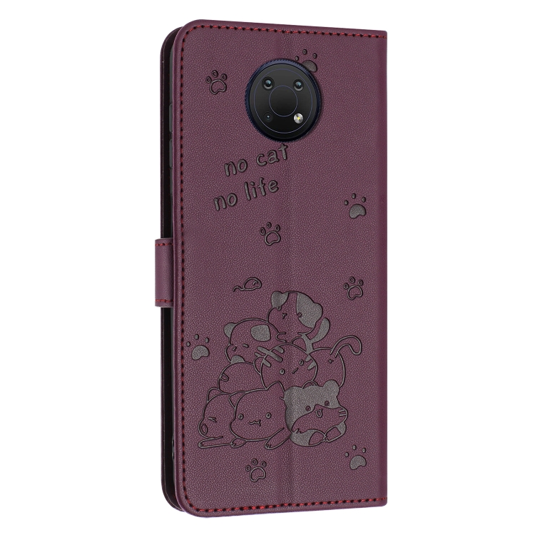Funda de Piel para Nokia G10/G20/G300 con Diseño de Gatito en Relieve y Cordón (Rojo Vino)