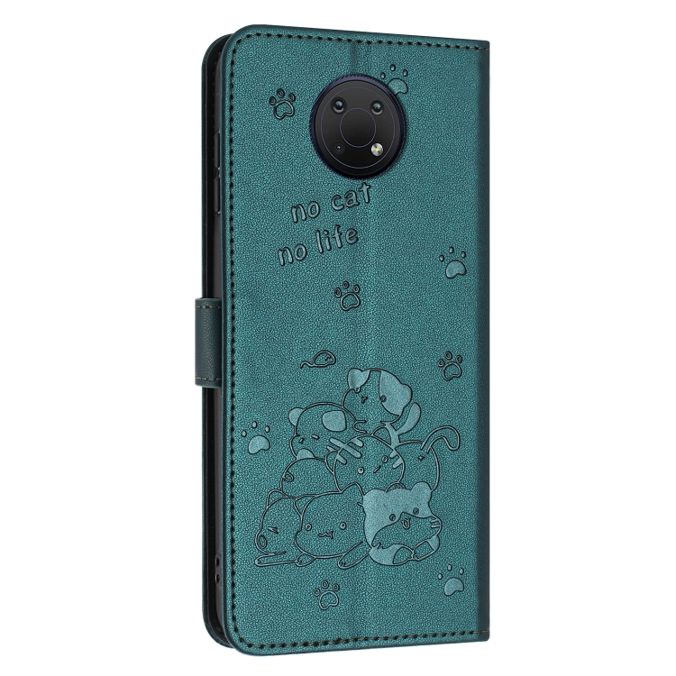 Funda de Piel para Nokia G10/G20/G300 con Diseño de Gatito en Relieve y Cordón (Verde Oscuro)