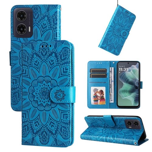 Funda de Piel Motorola Moto G35 con Diseño de Girasol en Relieve (Azul)