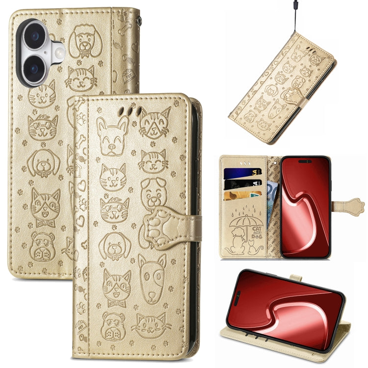 Funda de Piel con Relieve de Gato y Perro para iPhone 16 (Dorada)