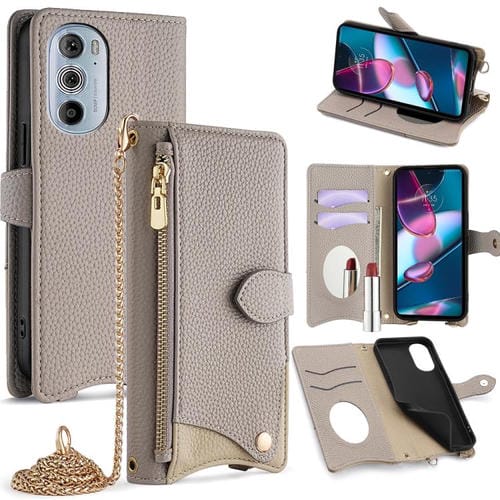 Funda Cuero Lichi Motorola Edge+ (2022) y Edge 30 Pro con Diseño Cola de Pez y Cadena Cruzada (Gris)