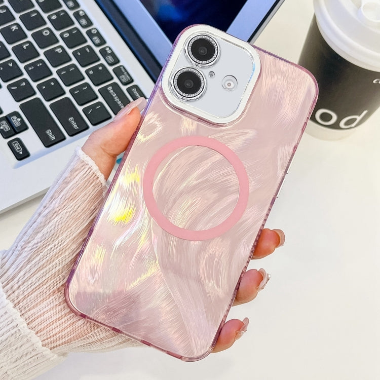 Funda de Teléfono TPU Magsafe para iPhone 16 con Textura Enchapada y Película de Lente (Hilo de Plumas Rosa)