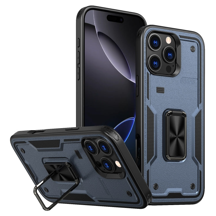 Funda híbrida TPU y PC con soporte de anillo para iPhone 16 Pro Max (Azul Marino)