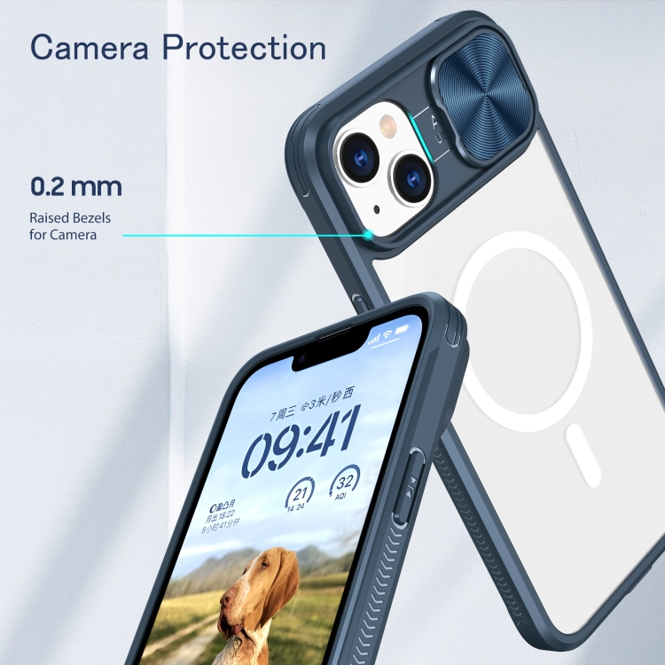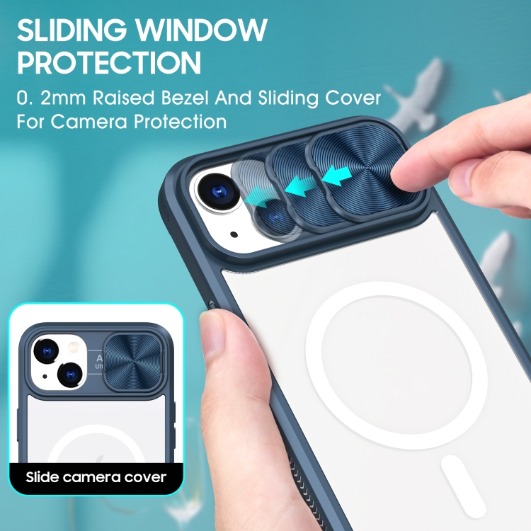 Funda para iPhone 14 Plus con Cubierta Deslizante Acrílico Transparente PC TPU Lente Magsafe Cobertura Total (Azul Marino)
