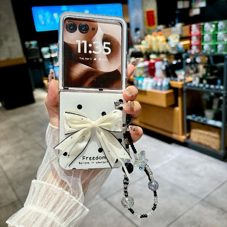 Funda para Motorola Razr 60 Ultra con purpurina y diseño de lunares y lazo (blanca)