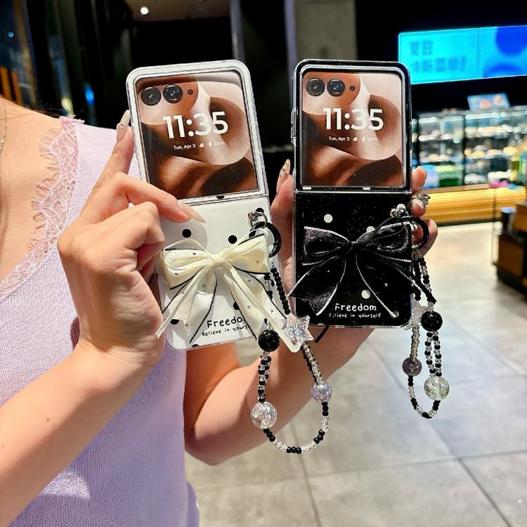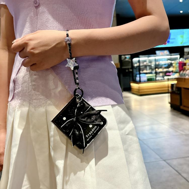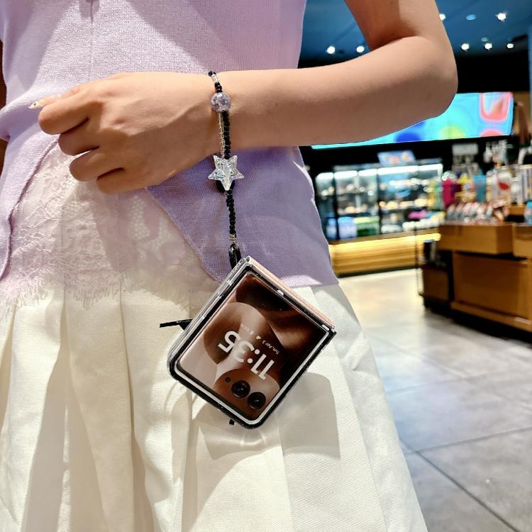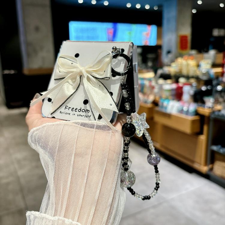 3. Correa tipo pulsera: Incluye una elegante correa de cuentas blancas y negras con detalles de estrellas y bolas de cristal, moderna y funcional para un mejor agarre.