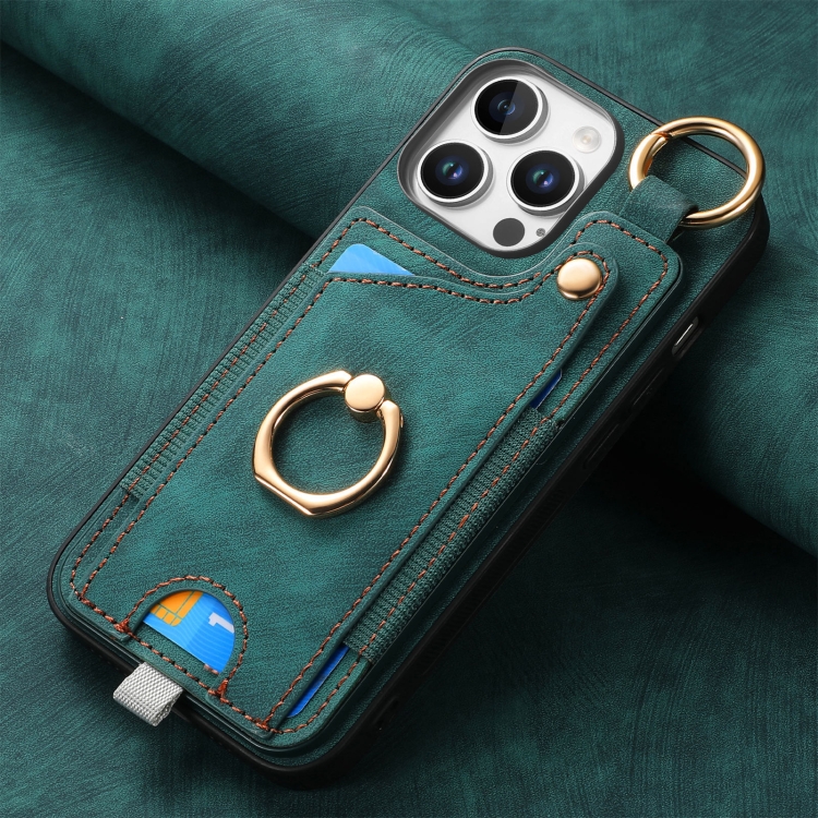 Funda para Teléfono iPhone 16 Pro Max con Anillo y Tarjetero Estilo Retro con Asa para Colgar (Verde)