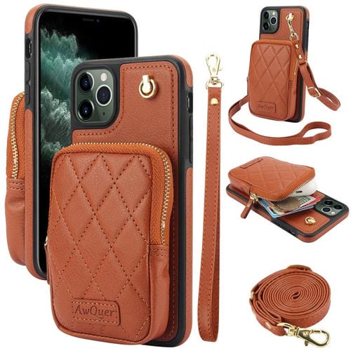 Funda para Teléfono Awquer iPhone 11 Pro Piel de Lichi Cremallera Diseño Cruzado (Marrón)
