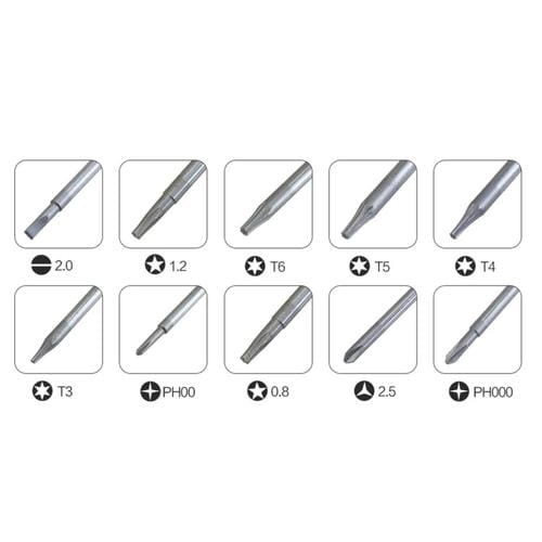 El kit contiene puntas de tamaños variados: 2.0, 1.2, T6, T5, T4, T3, PH00, 0.8, 2.5 y PH000, adecuadas para diferentes tipos de tornillos. -