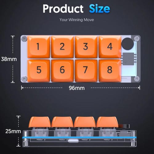 • 8 teclas programables con macros, Conexión USB, Cable de aproximadamente 1 metro, peso aproximado de 150 gramos, dimensiones de 9,6 x 3,8 x 2,5 cm, Soporte para interruptores intercambiables en caliente de 3 o 5 pines, 4 modos de efectos de iluminación multicolor