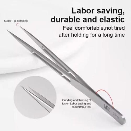 Las Pinzas de Acero Inoxidable No Magnéticas MaAnt SS-A1 son una Herramienta profesional diseñada para usuarios que realizan reparaciones de Piezas pequeñas en dispositivos electrónicos como Teléfonos Móviles y Computadoras. Este modelo cuenta con puntas pequeñas y extendidas, fabricadas en acero inoxidable antimagnético, lo que permite manipular Componentes delicados y finos sin riesgo de interferencias magnéticas. Su construcción reforzada ofrece alta resistencia, buena tenacidad y elasticidad, facilitando una sujeción firme y cómoda durante largos periodos de uso. Además, incluyen un tubo Protector de PVC que previene daños y mantiene la integridad de las puntas cuando no están en uso.