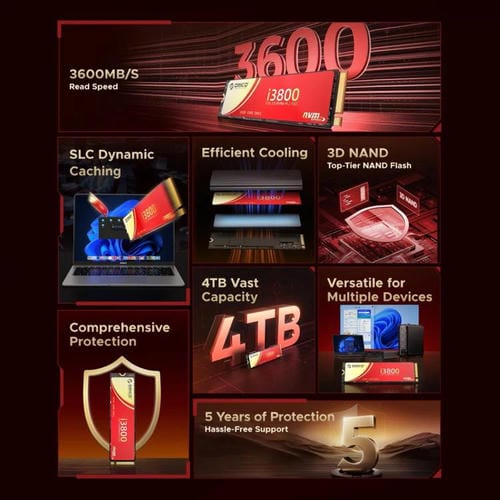 • Interfaz PCIe 3.0 x4; velocidades de lectura hasta 3600 MB/s; velocidades de escritura hasta 3100 MB/s; optimización inteligente de caché SLC y gestión avanzada del almacenamiento NAND