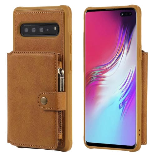 Estuche Protector Galaxy S10 5G con Cremallera Ranuras Tarjetas Soporte Fotos Billetera (Marrón)