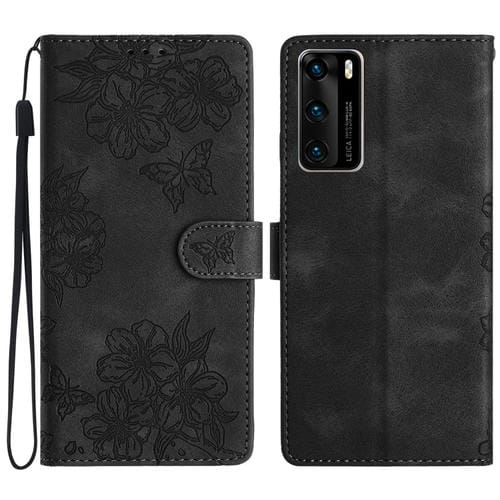 - 1x Funda para Huawei P40 Cherry Blossom Butterfly Skin Feel de PU en Relieve (Negro)