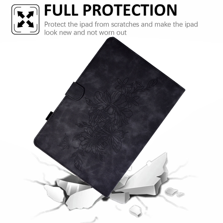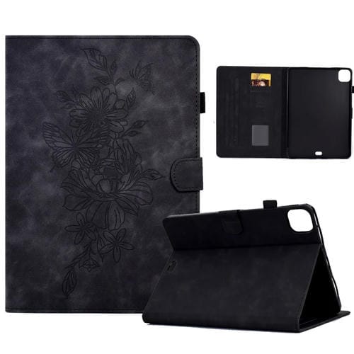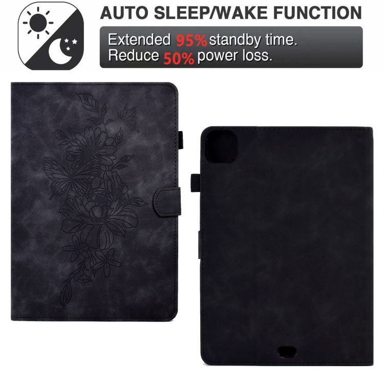 Funda Inteligente de Cuero para iPad Pro 11 (2024) con Estampado de Mariposas y Peonías (Negro)