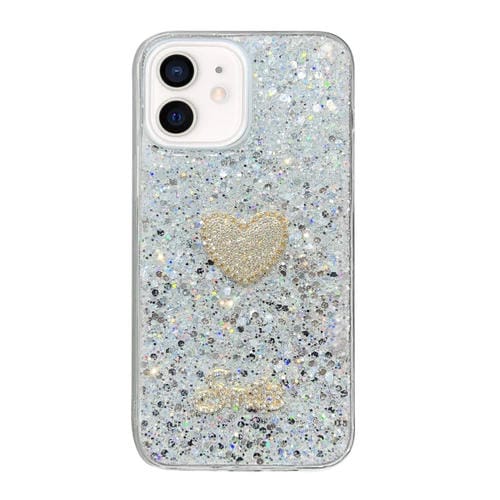Funda para Teléfono TPU Epoxi iPhone 12 Mini Corazón de Diamante y Lentejuelas Estrelladas (Plateado)
