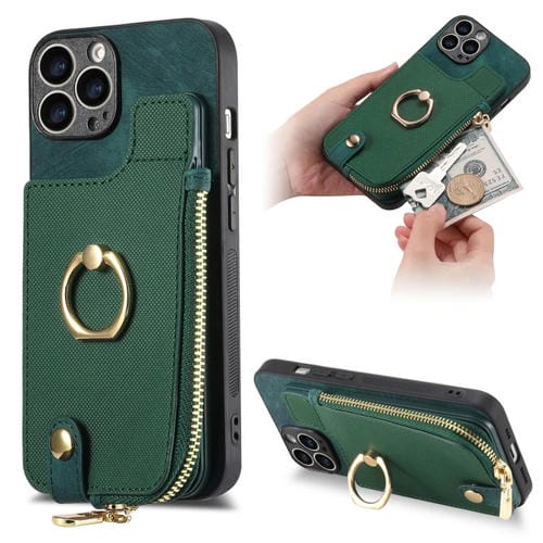 Funda para Teléfono iPhone 12 Pro Anillo Cuero Cruzado Cremallera Billetera (Verde)