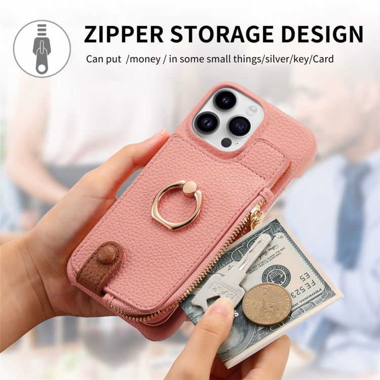 Funda Trasera para iPhone 13 Pro Max con Billetera, Cremallera y Anillo de Cuero Litchi (Rosa)
