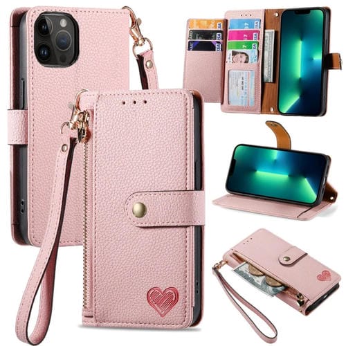 Funda de Cuero para iPhone 13 Pro Max Love Zipper Lanyard para Teléfono (Rosa)