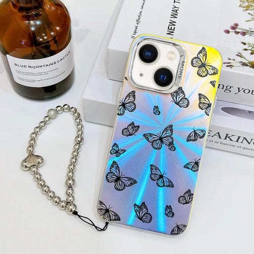 Funda para Teléfono iPhone 14 Mariposa Láser Galvanizada con Correa para Muñeca (Negra)