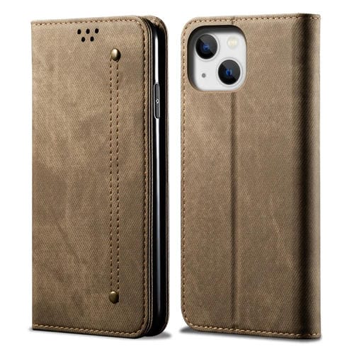 Funda para iPhone 15 Cuero Denim Texture con Tapa Horizontal (Caqui)