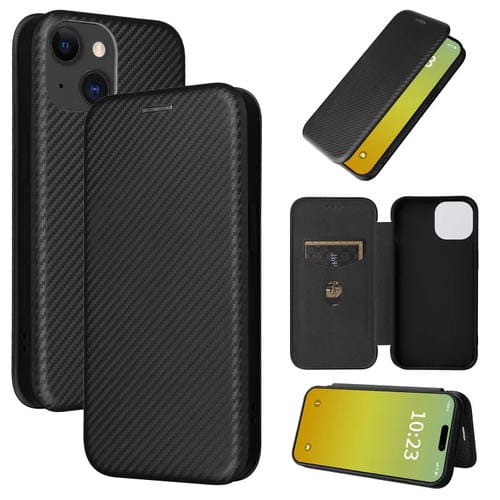 Funda de Teléfono para iPhone 15 con Tapa de Cuero y Textura de Fibra de Carbono (Negro)