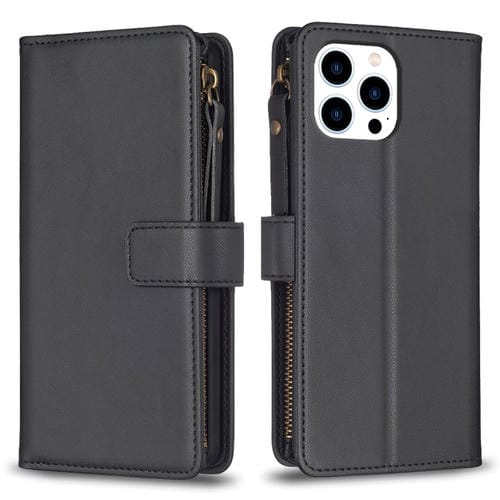 Funda Cartera para iPhone 15 Pro 9 Ranuras para Tarjetas Cremallera Cuero con Tapa (Negro)