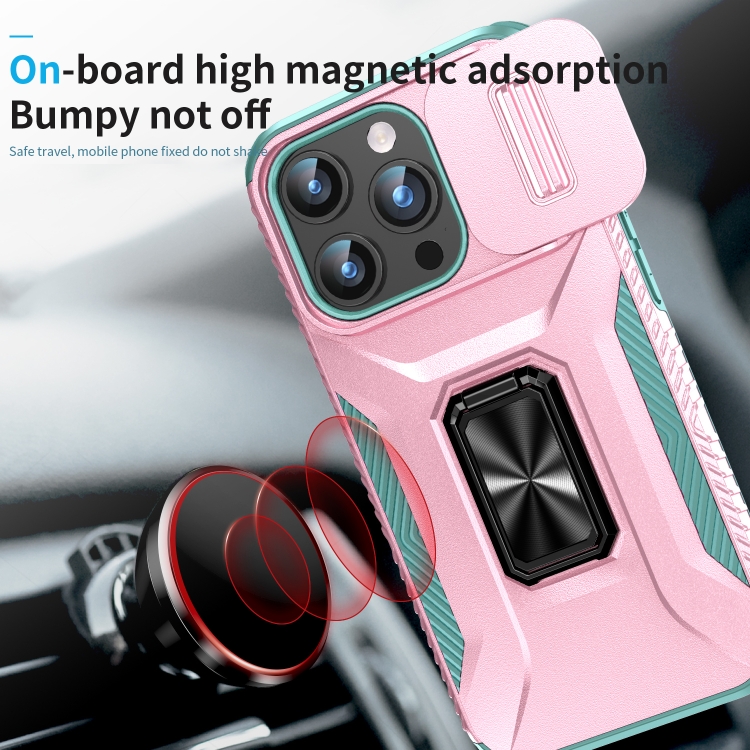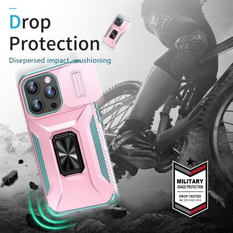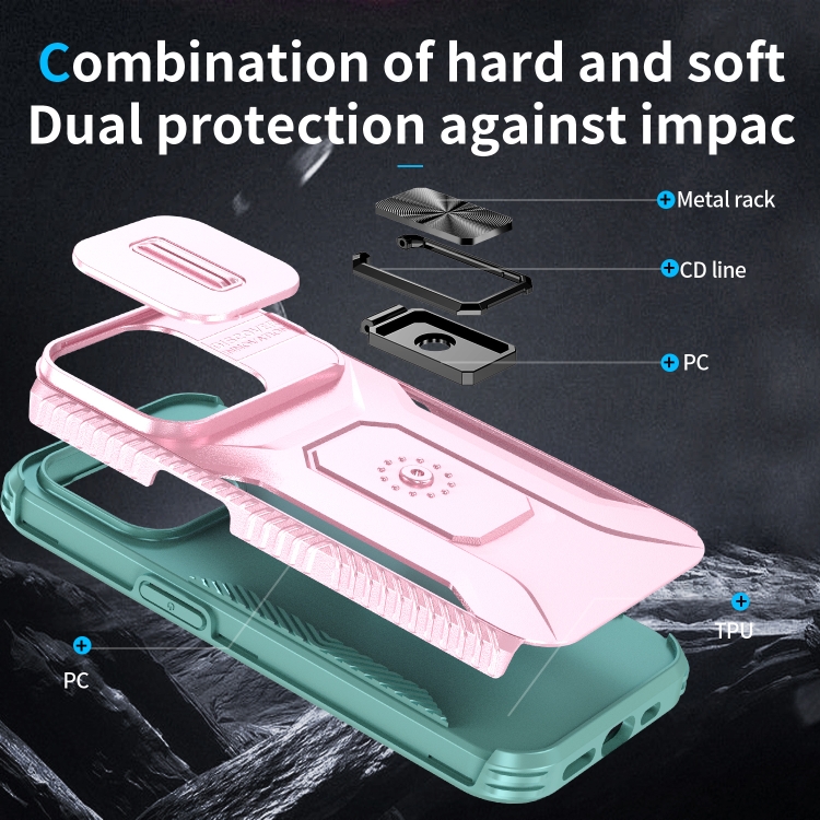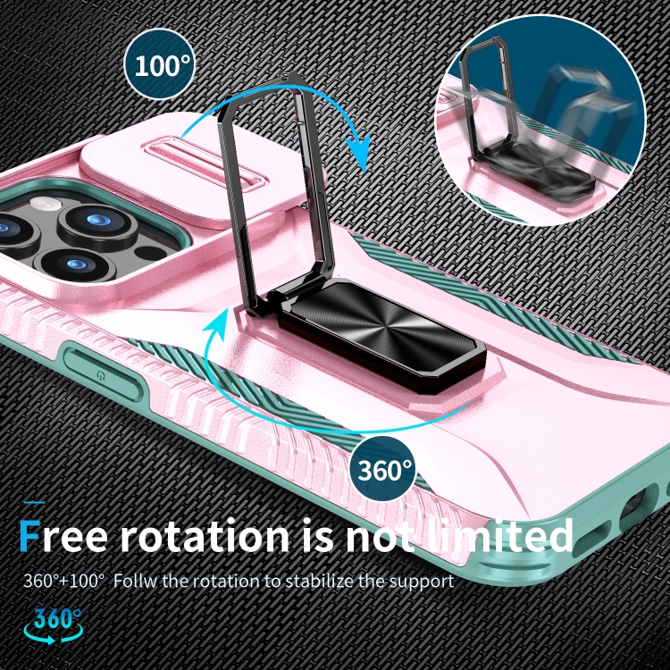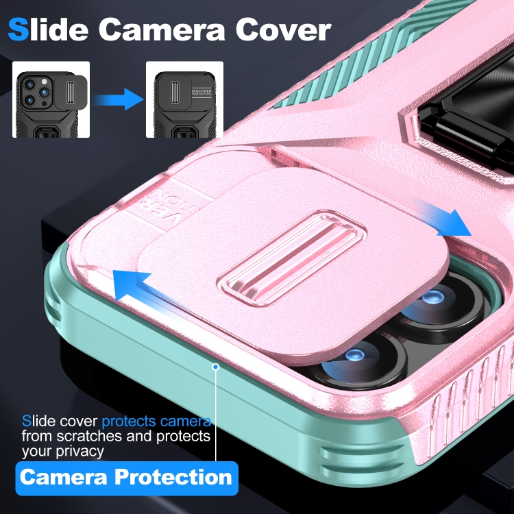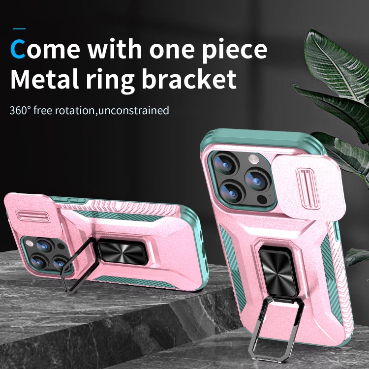 Estuche para teléfono iPhone 15 Pro con soporte deslizante para levas (Rosa + Gris Verde)