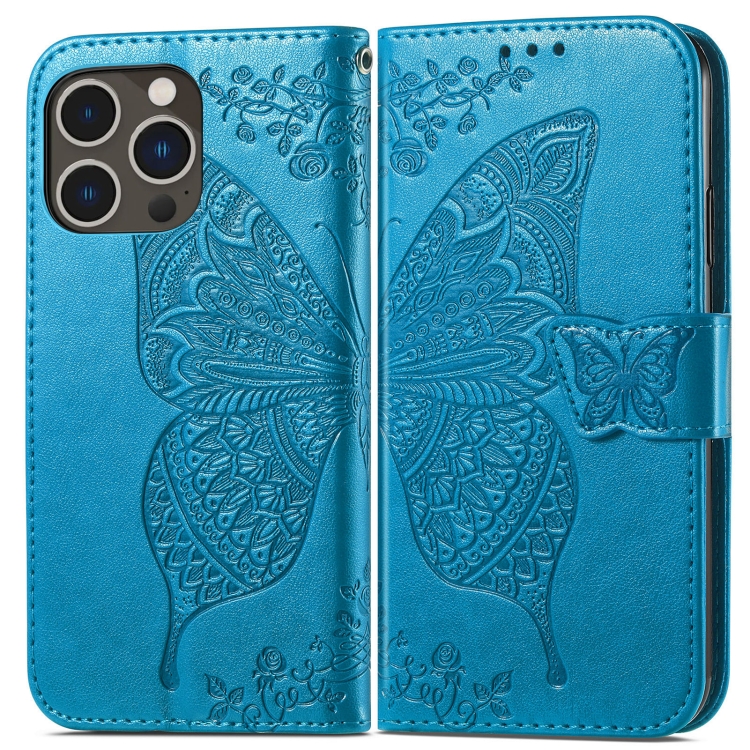 Estuche para Teléfono iPhone 15 Pro Max Butterfly Love Flower Cuero En Relieve (Azul)