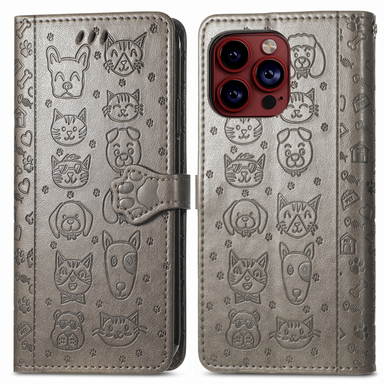 Funda para Teléfono iPhone 15 Pro Max Cuero Relieve Perro y Gato (Gris)