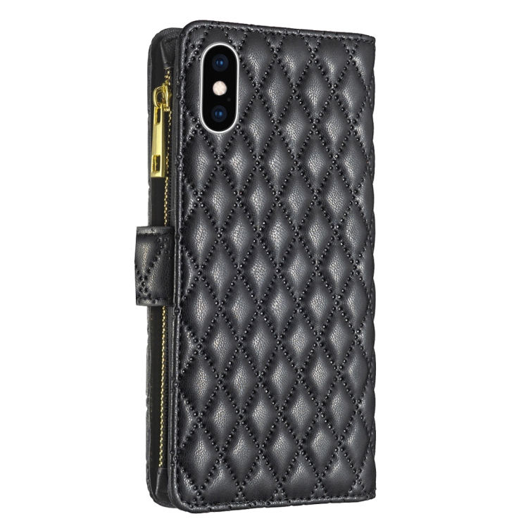 Funda para iPhone X / Xs Diamond Lattice Zipper Wallet de Cuero con Tapa (Negro)