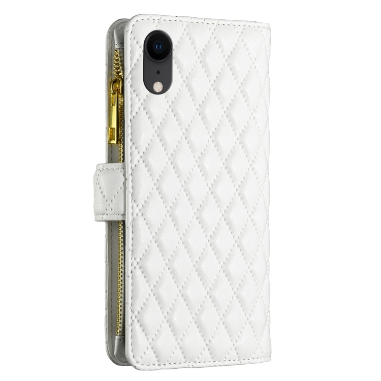 Funda para iPhone Xr Diamond Lattice Zipper Wallet de Cuero con Tapa para Teléfono (Blanco)