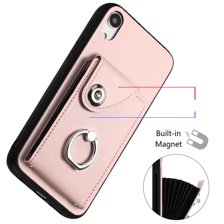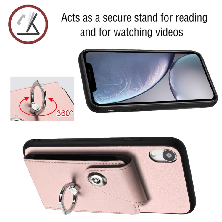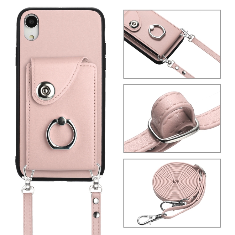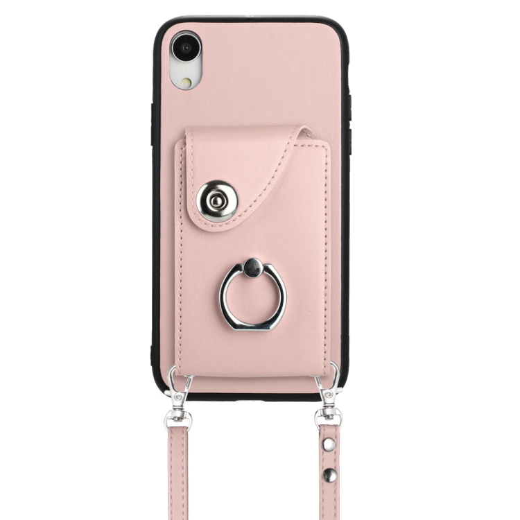 Funda para Teléfono iPhone Xr con Soporte para Anillo y Bolsa para Tarjeta de Órgano con Cordón Largo (Rosa)