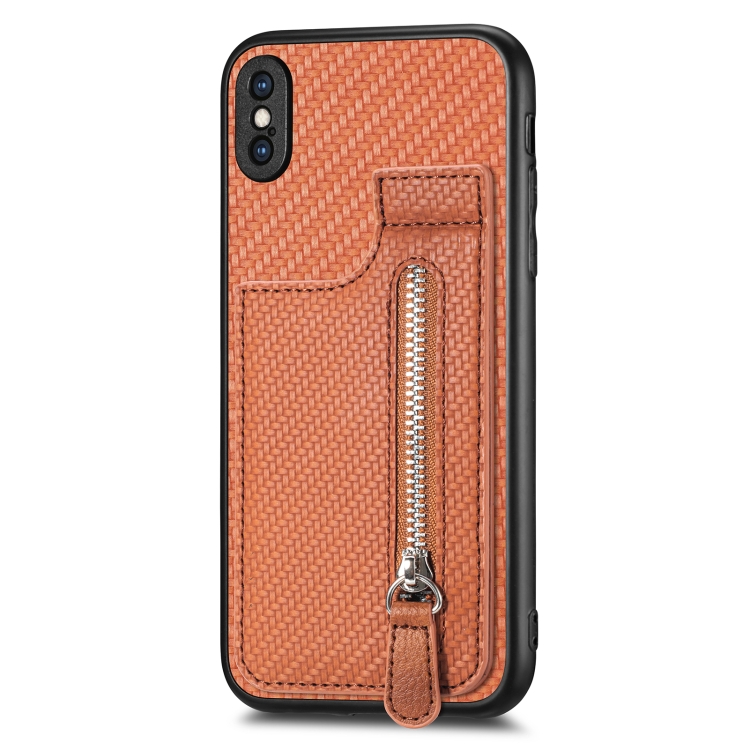 Funda de teléfono iPhone Xs Max con cremallera vertical de fibra de carbono (Marrón)