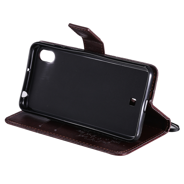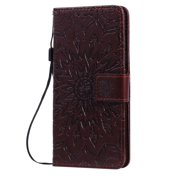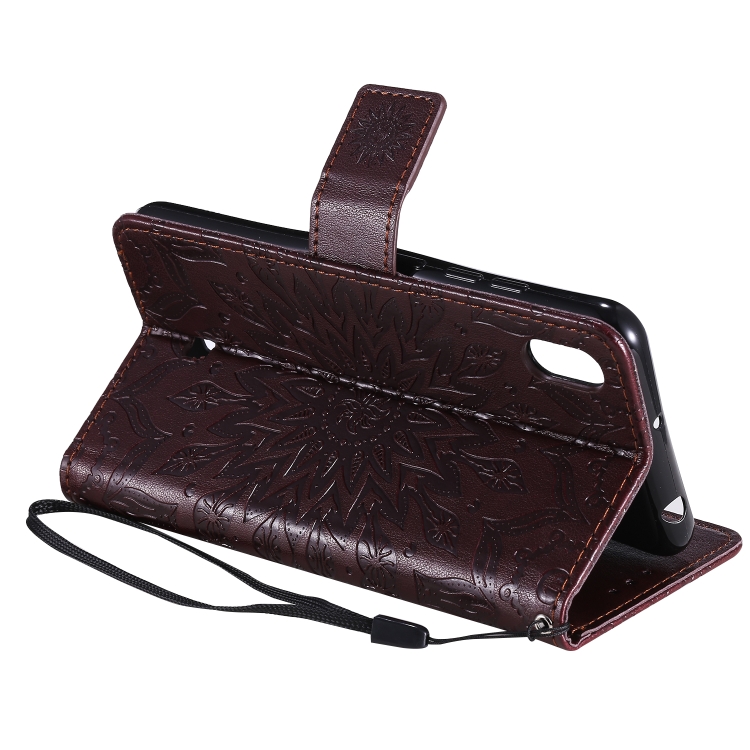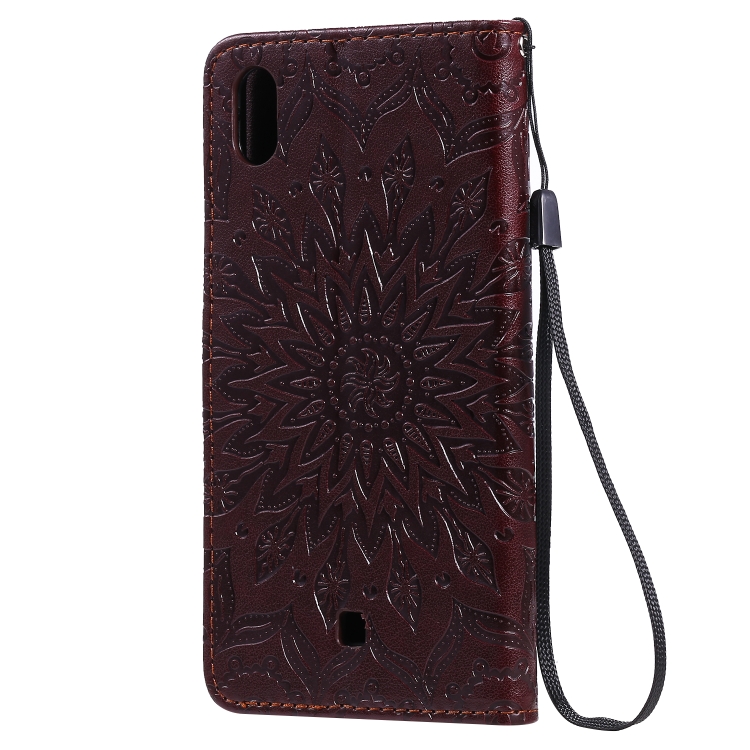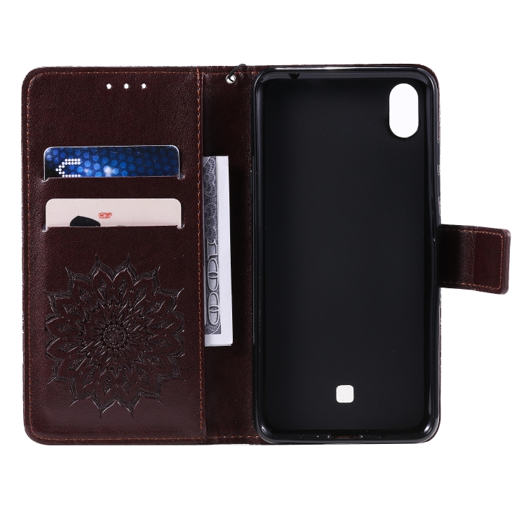 Funda Cuero PU LG K20 (2019) Patrón Girasol con Tapa, Soporte, Ranuras y Cordón (Marrón)