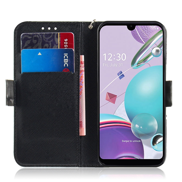 Funda de Cuero Abatible Horizontal para LG K31 con Dibujo 3D, Soporte, Ranuras para Tarjetas, Billetera y Cordón (Hug Cat)