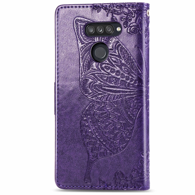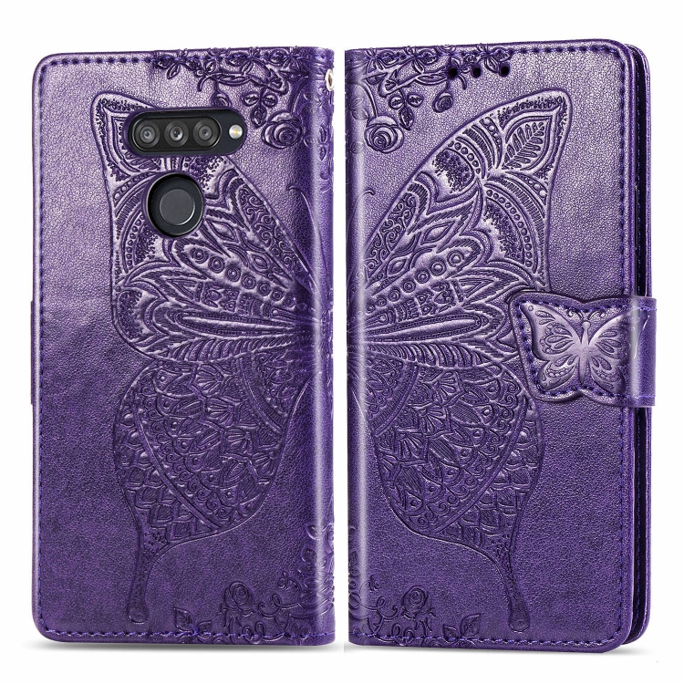 Funda de Cuero para LG K50S Butterfly Love Flower con Tapa Horizontal, Soporte, Ranura para Tarjeta y Cordón (Morado Oscuro)