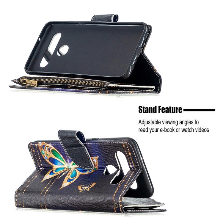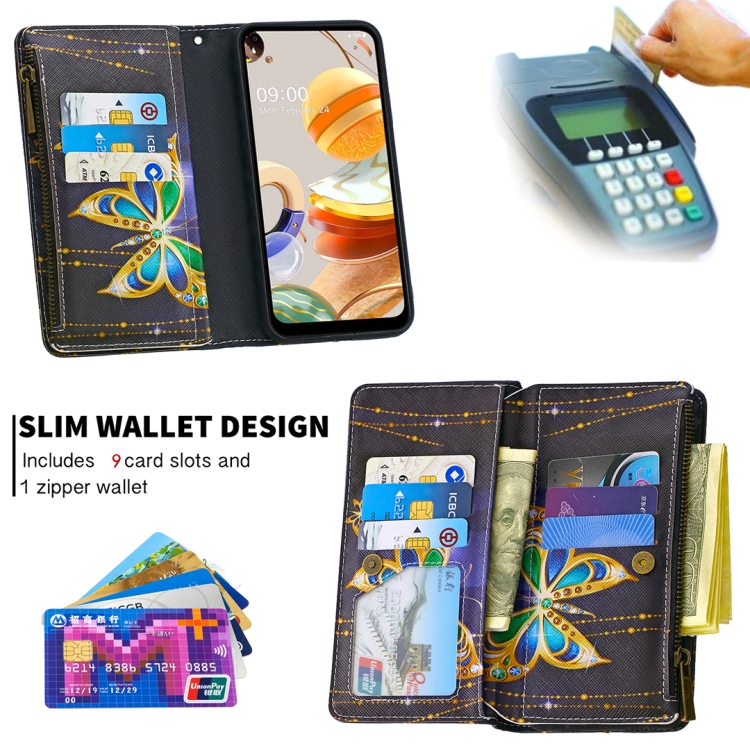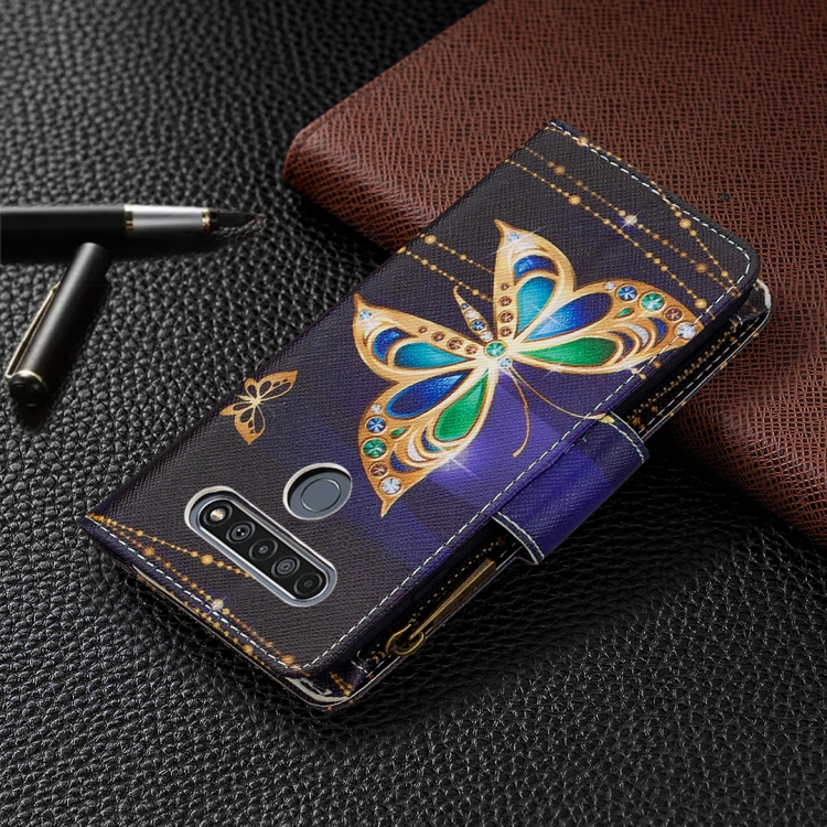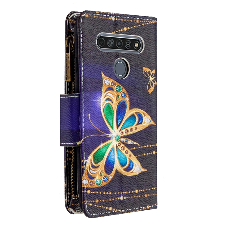 Funda de Cuero para LG K61 con Patrón de Dibujo, Cremallera, Soporte y Ranuras para Tarjetas (Big Butterfly)